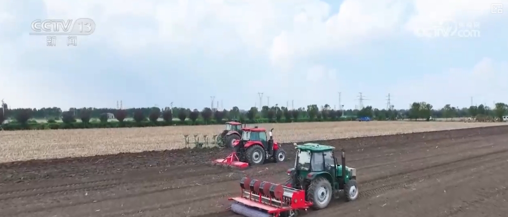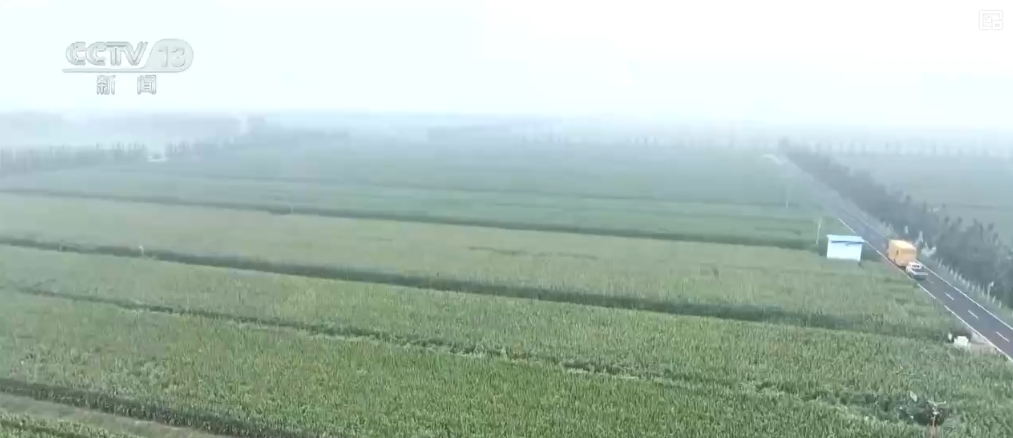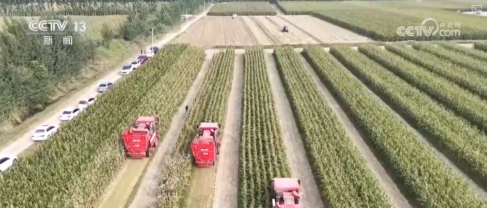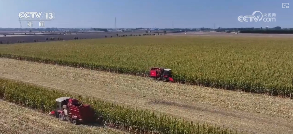 山东滨州无棣县小泊头镇的这片高标准农田里,栽培的是绿莹莹、长势喜人的玉米。4台大型收割机来回络绎,一派丰盈的现象。