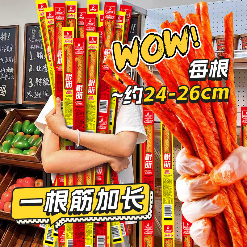 网红一根筋加长牛筋辣条,单根24-26cm,经典配方,精选小麦粉,细腻香醇,麻辣十足,色泽诱人,柔韧劲道。目前天猫商城淘宝买菜农场直发价格¥15.8,下单秒杀立减¥5,实付¥10.8包邮。